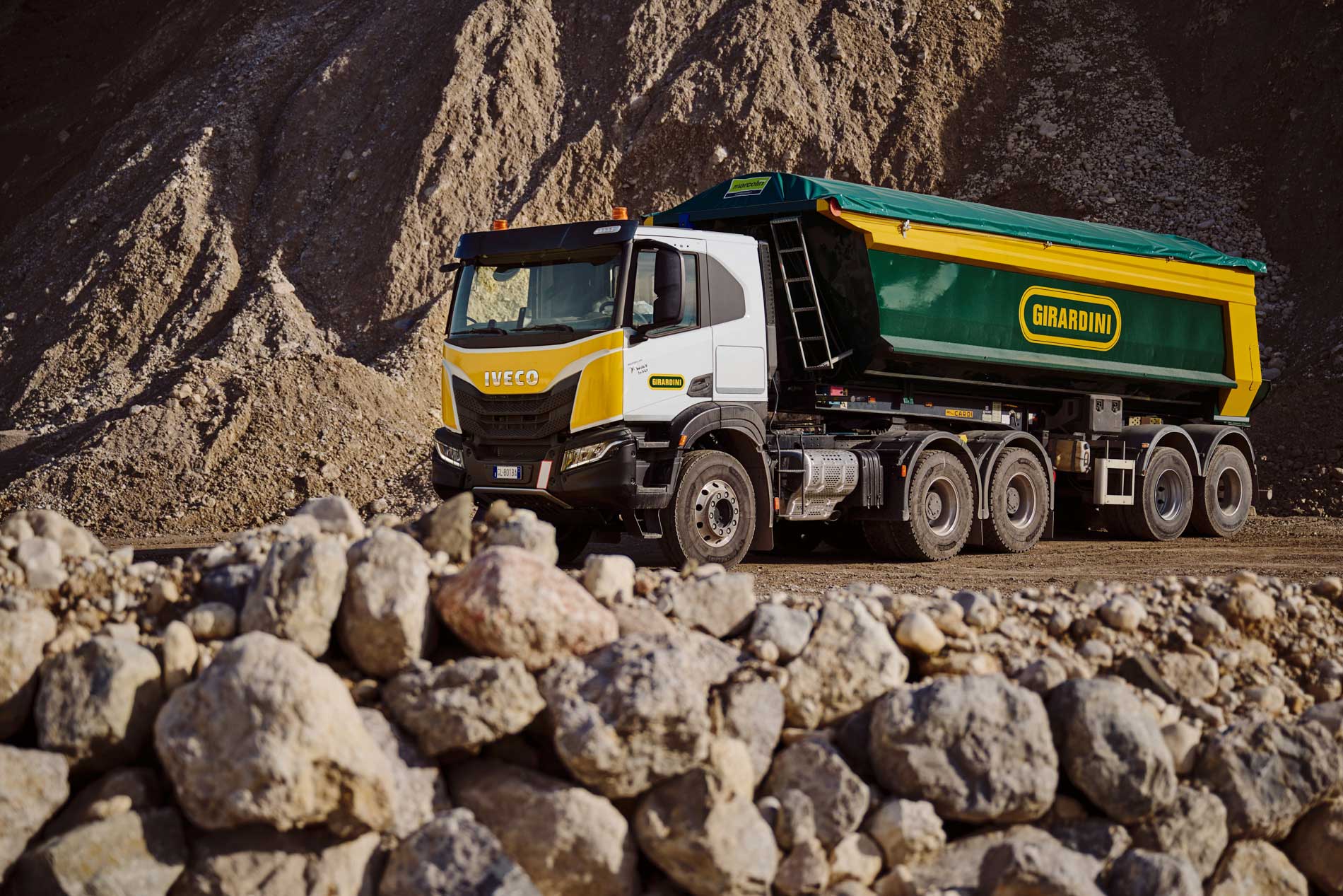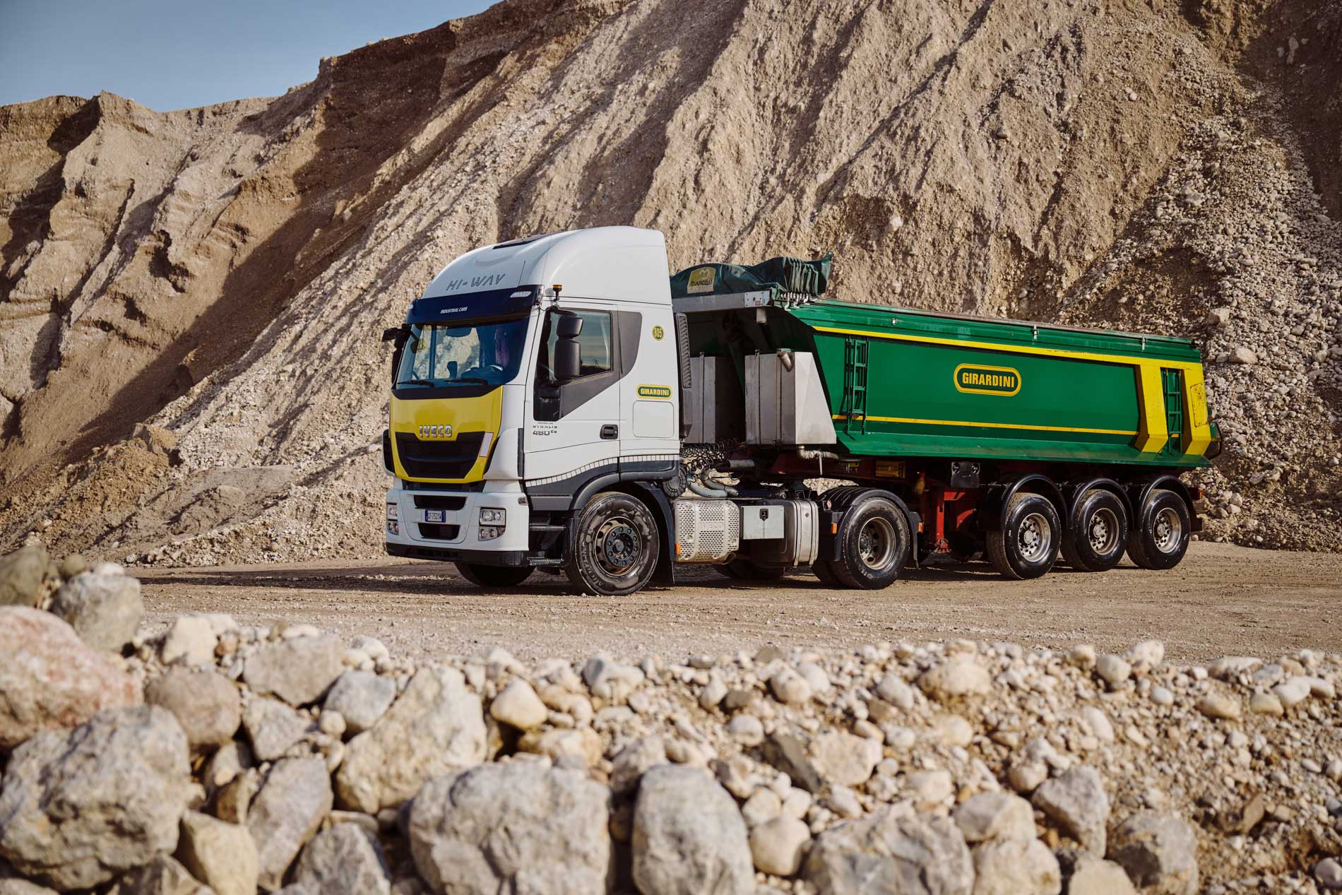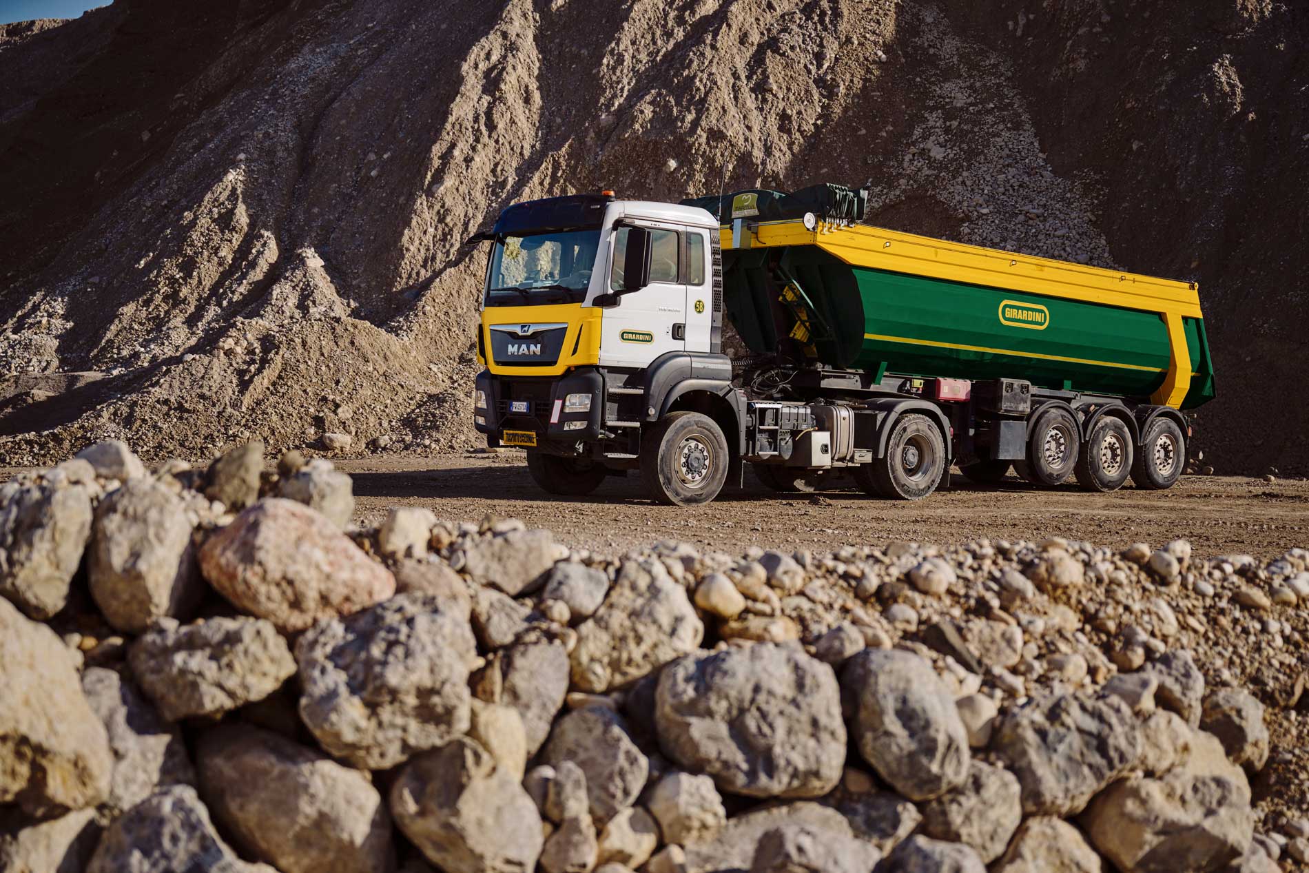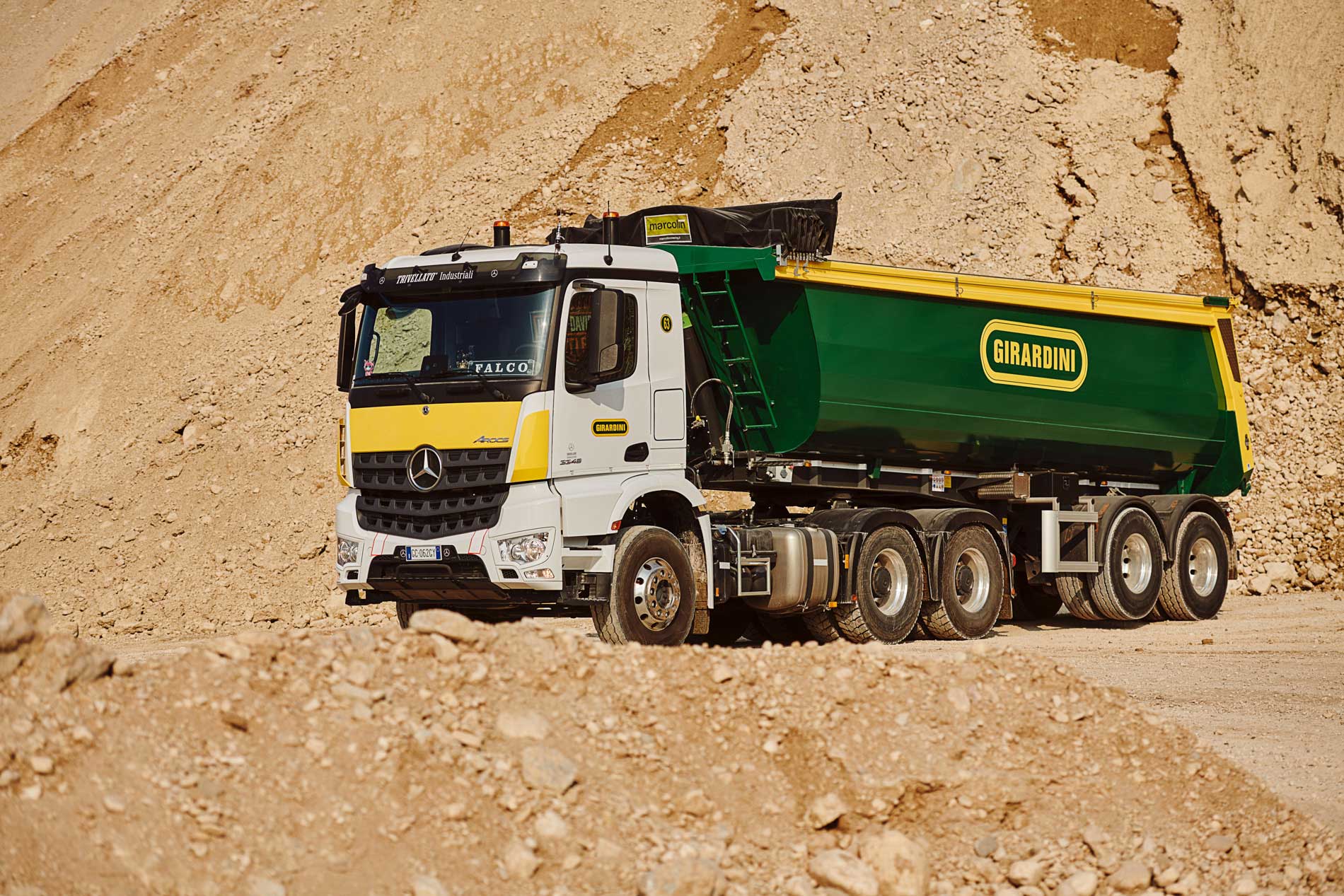 Bilico mezzo d’opera abbinato ad una vasca per il trasporto di inerti o conglomerati.