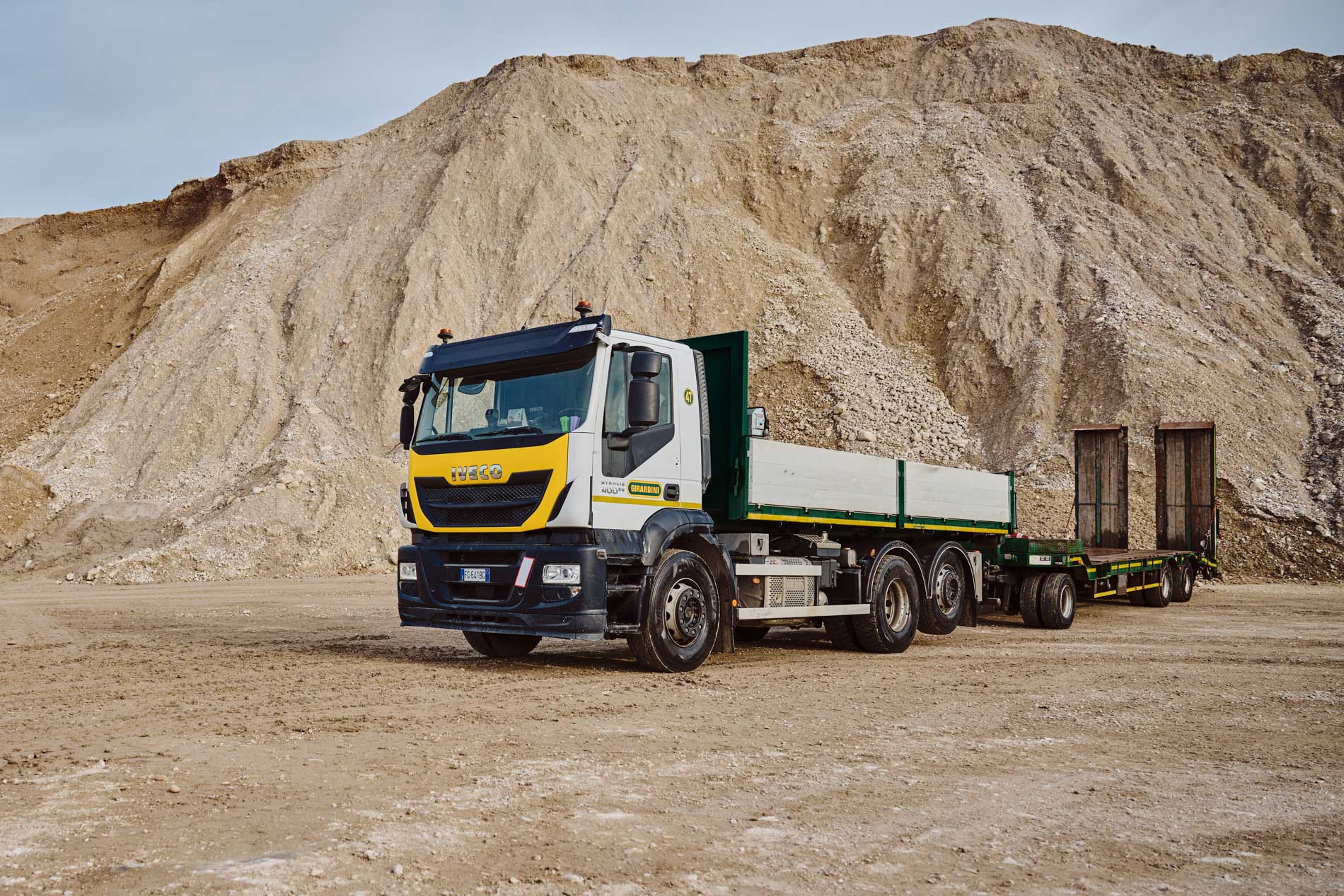 Classico bilico stradale abbinato ad una vasca per il trasporto di inerti o conglomerati.