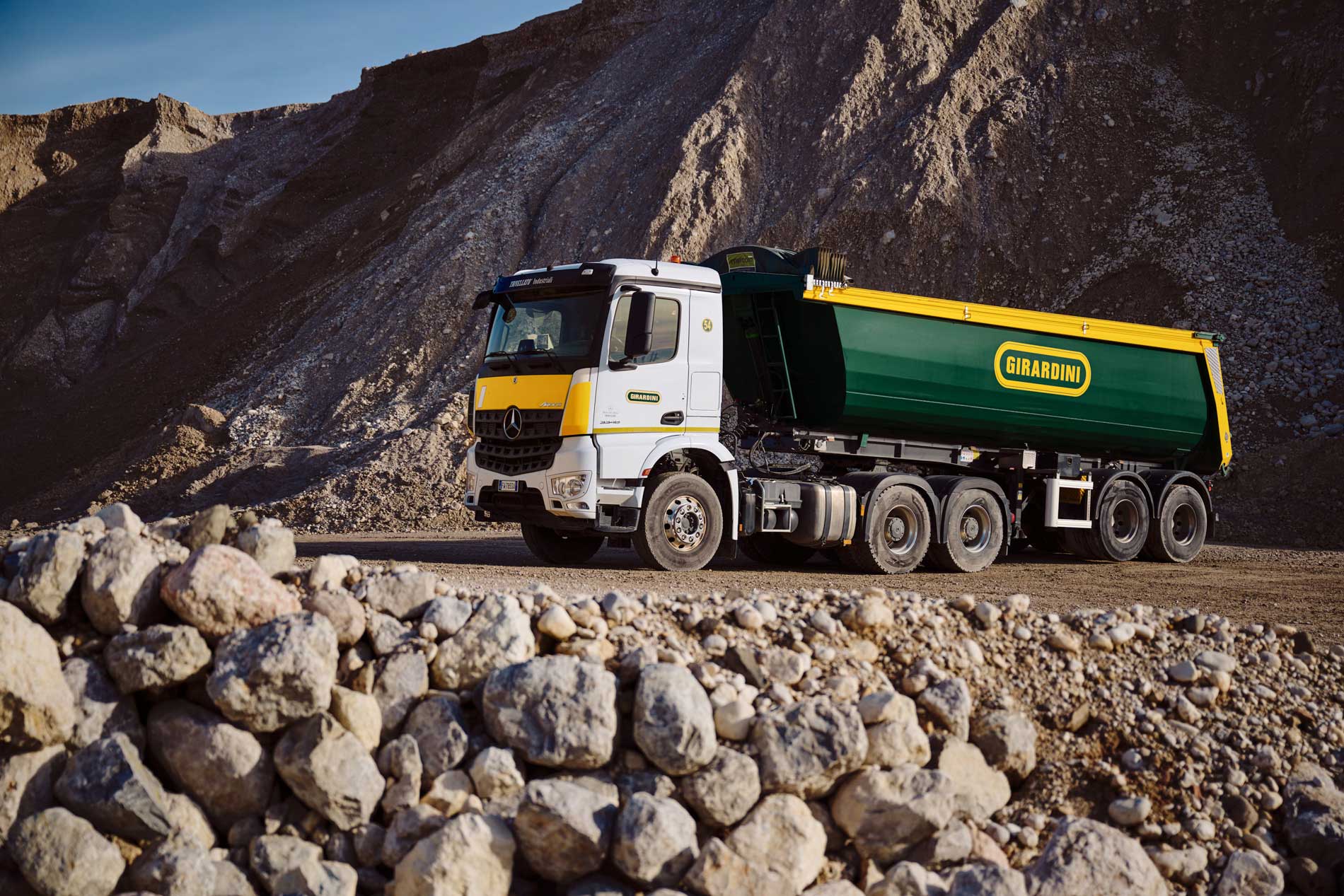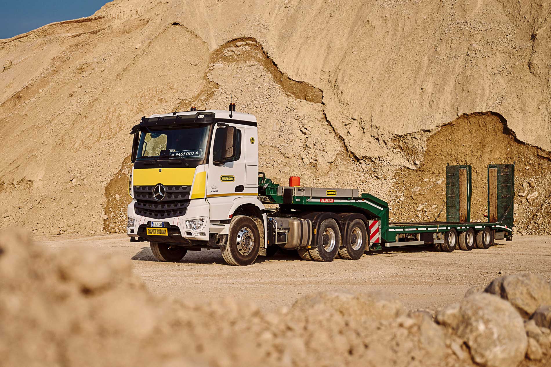 Motrice mezzo d'opera dotato di 4 assi 8x4 che consentono una maggiore portata sia in cava che in cantiere. Grazie alle sue caratteristiche è un ottimo mezzo per il trasporto nelle aree di montagna, dove un bilico non riuscirebbe a passare.
