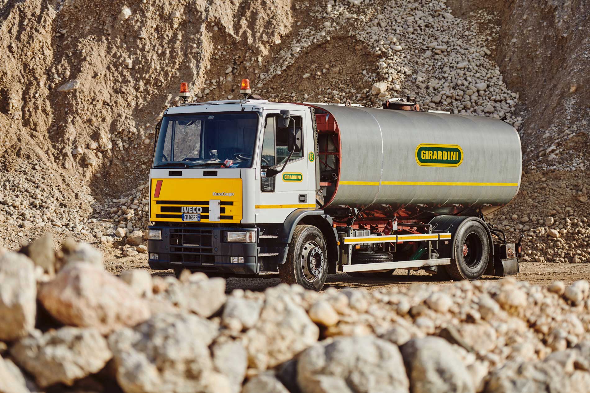 Iveco Euro Cargo con spruzzatrice Massenza, con barra estendibile comandata dall’operatore in cabina. Può utilizzare diversi tipi di emulsione.