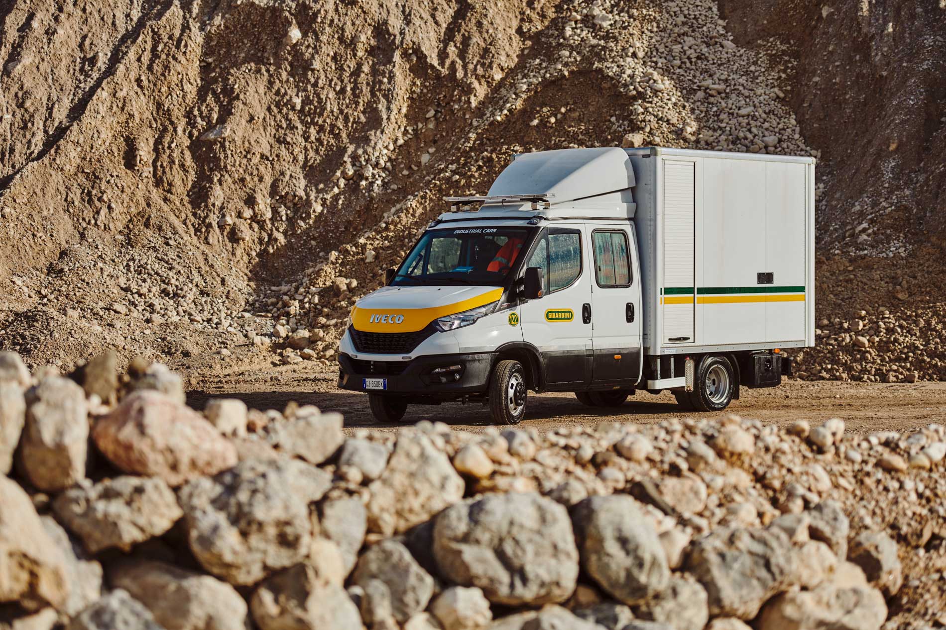Il furgone Iveco Daily 35 svolge la funzione di officina mobile a servizio dei mezzi di cantiere, attrezzato con compressore aria, gruppo elettrogeno e generatore per attrezzature a funzionamento idraulico.