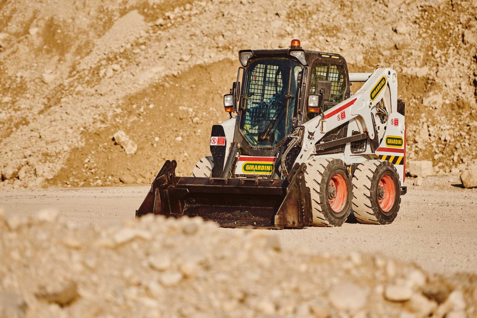 Pala gommata utilizzata in cantiere come mezzo multiservizio: può essere equipaggiata con la benna miscelatrice per la preparazione di calcestruzzo, con le forche da carico per le funzionalità di sollevamento, e la benna per la movimentazione di materiali e inerte. Viene applicata in cantieri misti che prevedono soprattutto la realizzazione e sistemazione di fognature, acquedotti, piste ciclabili.